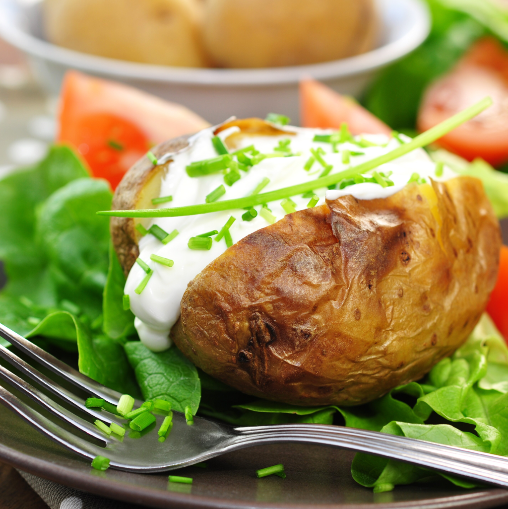 - A baked sweet potato with a mixed bean chilli and cheese, or cottage cheese with salad