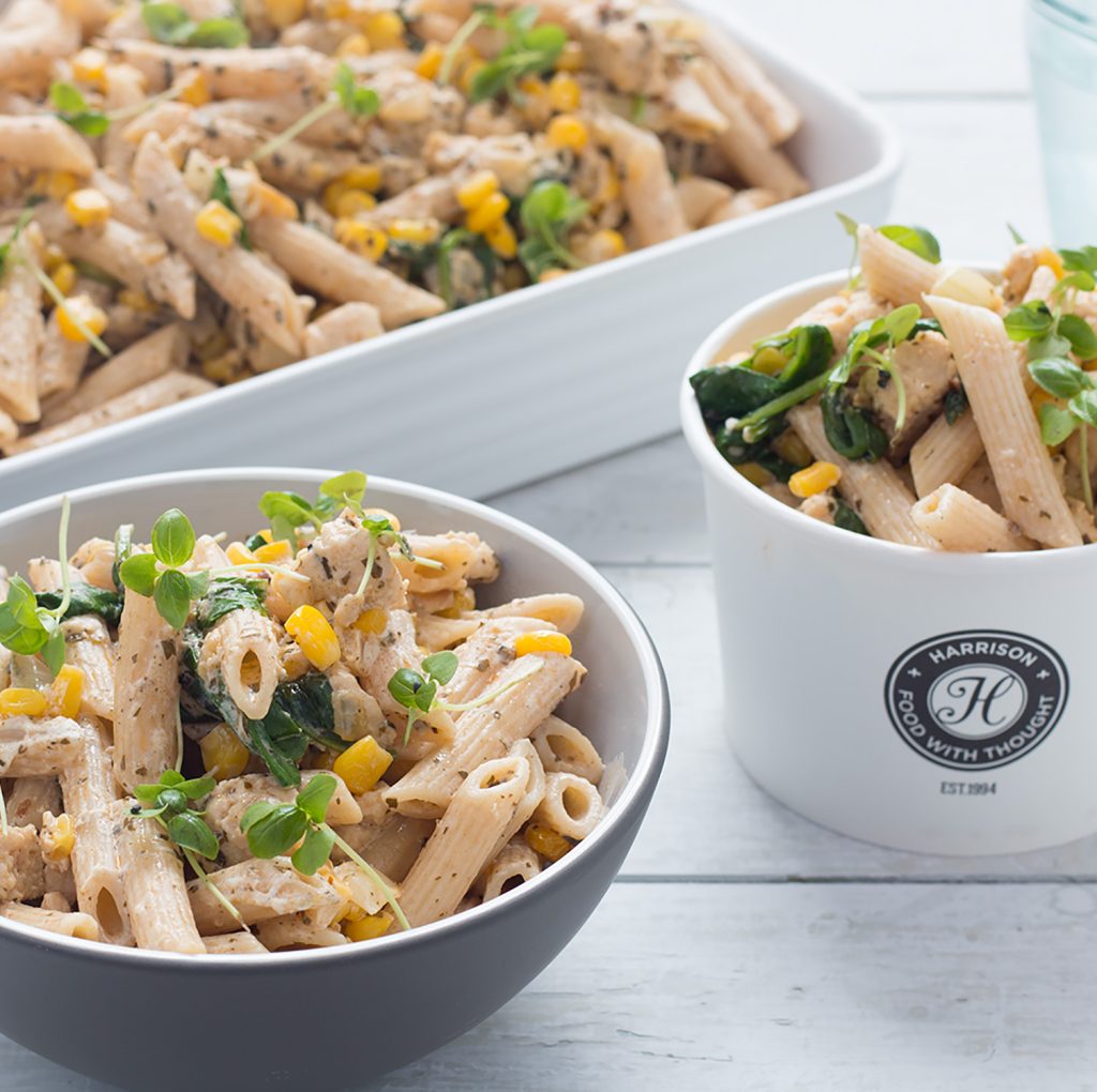 - Wholegrain pasta pot with mozzarella cheese and tomatoes with hummus and vegetable sticks